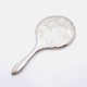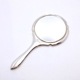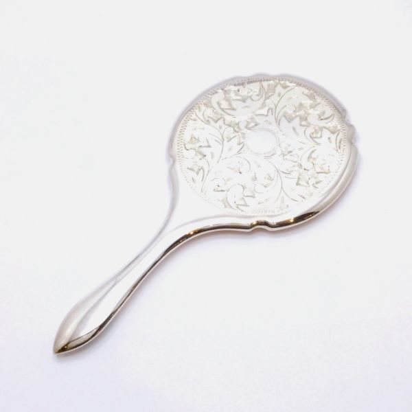 持ち手がついた銀製手鏡。大サイズの鏡面は一般的な円形コンパクトの鏡とほぼ同じ大きさ。 背面には優美な唐草(アラベスク)柄の彫刻が施された華やかな仕上がり。 背面中央の丸い無地部分や持ち手にイニシャルなどの文字彫刻が可能です。 ※デザイン彫刻や文字彫刻は特注・別料金での承りとなります。ご要望を備考欄にご記入ください。確認とお見積り後、彫刻代金を含めたご請求金額をお知らせ致します。